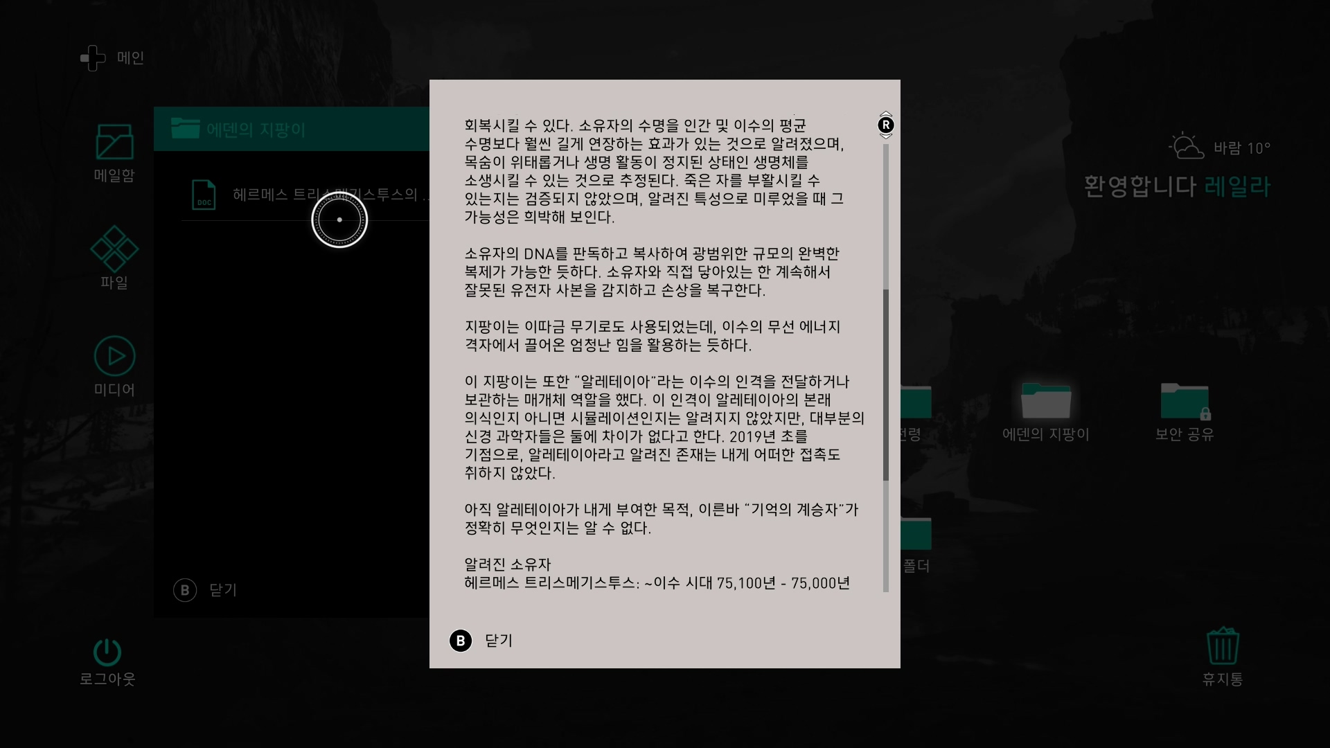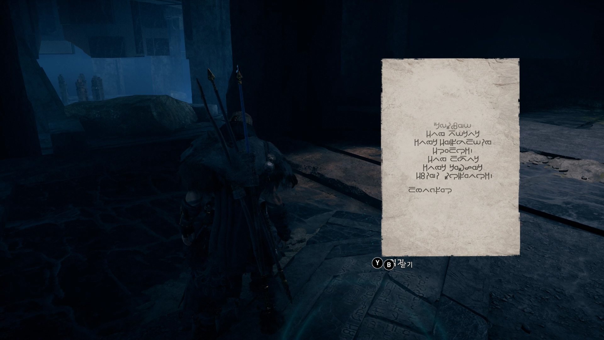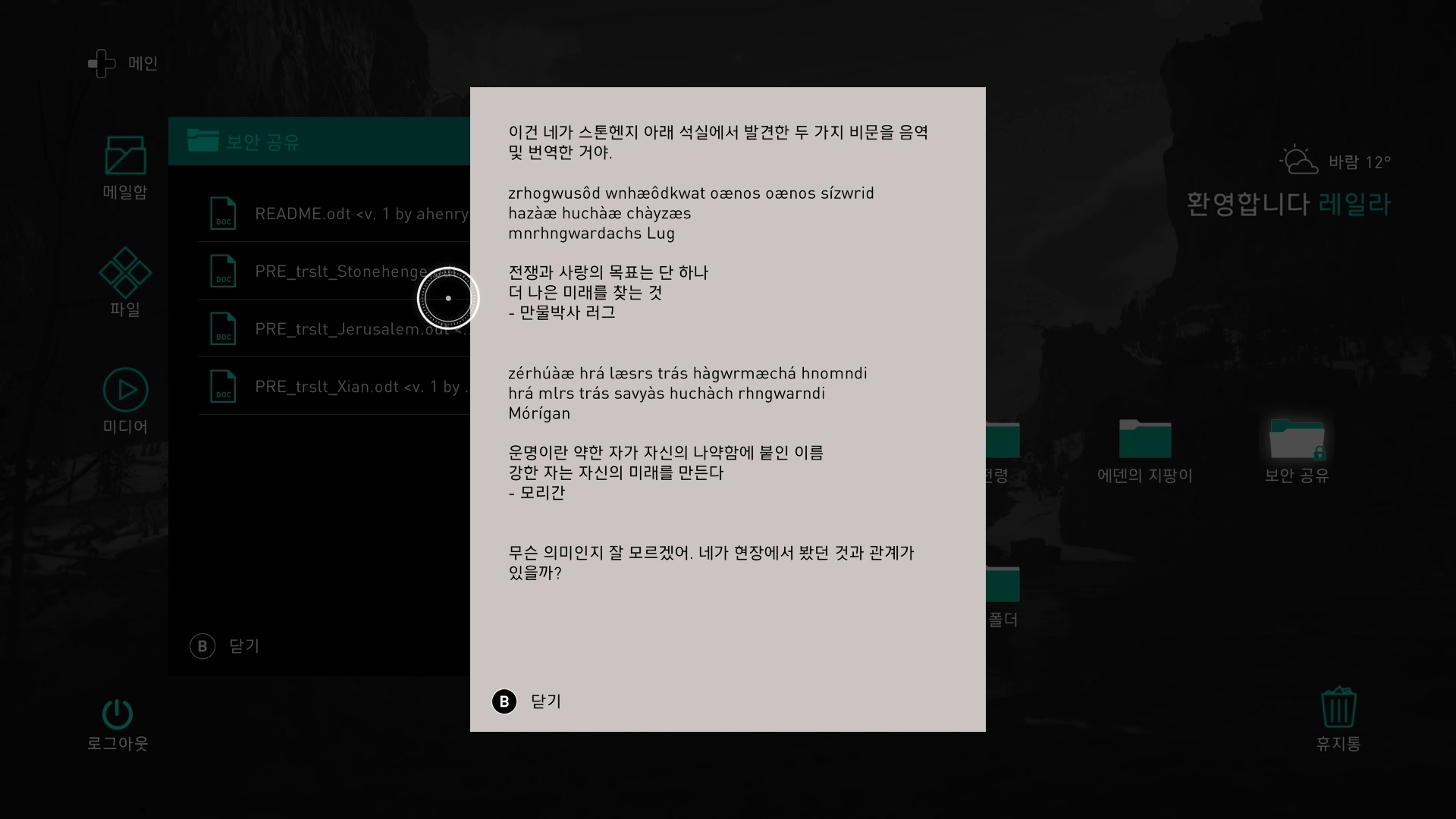 그리고 엑스칼리버를 찾으러 들어간 이수 병영에서 이수 민족의 문자로 남겨진 글을 발견할 수 있습니다. 애니머스 안에서는 해석이 되지 않지만, 레일라의 노트북을 살펴보면 문장의 해석본이 나옵니다.