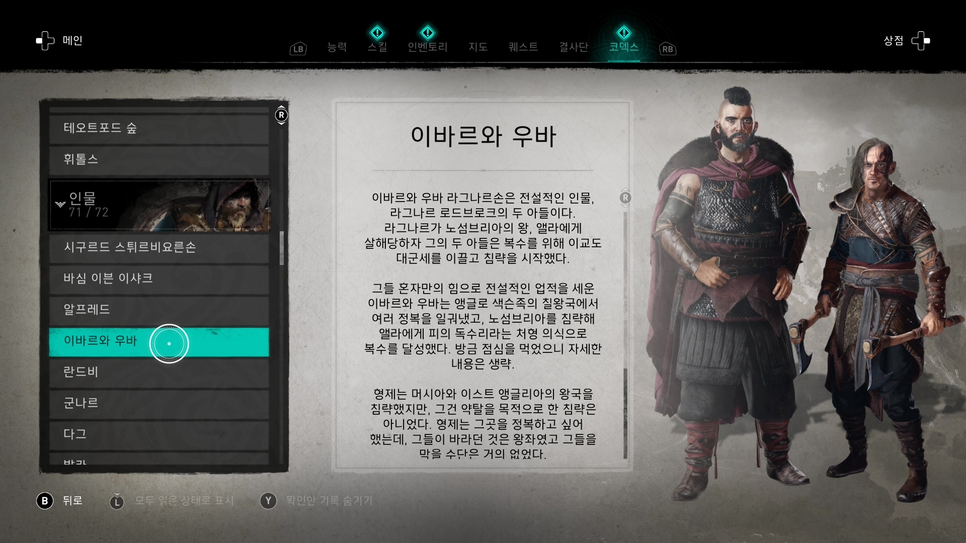 게임에서 언급되지 않은 라그나르의 다른 아들들에는 시구르드(덴마크의 시조), 비요른(스웨덴의 시조), 헤스테인이 있습니다. 시구르드는 엘라 왕 처단 후에는 본거지인 덴마크로 돌아갔고, 비요른과 헤스테인은 잉글랜드가 아니라 이탈리아 반도와 이베리아 반도를 침공했기에 굳이 언급되지 않은 걸로 보입니다.