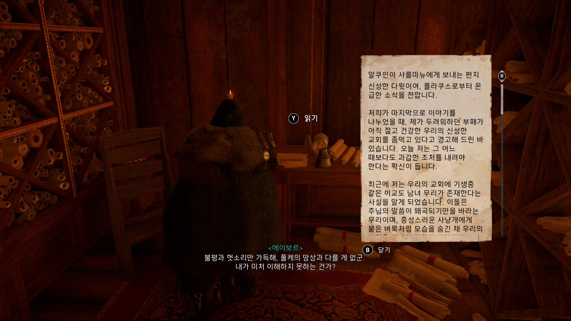 알프레드의 서재를 조사하면 알쿠인이라는 사람이 샤를마뉴에게 보낸 편지를 읽어볼 수 있습니다. 그는 고대 결사단이란 조직이 기독교를 오염시키니 몰아내야 한다는 편지를 보냈으나, 정작 샤를마뉴 본인이 그 결사의 일원이였기에 숙청당했죠. 다만 2편 상형 문자 퍼즐에서 그는 에덴의 조각 - 검을 소유하지 않은 걸로 나오기에 그와 관련된 에덴의 조각은 나오지 않을 듯 싶습니다.